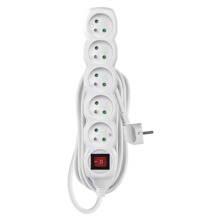 Prodlužovací kabel 5 m / 5 zásuvek / s vypínačem / bílý / PVC / 1,5 mm2 == barva: bílá|délka: 5 m|dětské clonky: ano|krytí: IP20|materiál zásuvky a vidlice: plast|max. zátěž: 3 680 W|napětí: 250 V~|počet zásuvek: 5|prodejní obal: 1 ks, závěs|proud: 16 A max.|průřez vodiče: 1,5 mm?|typ izolace: PVC|USB výstup: ne|vodič: H05VV-F3G|vypínač: ano