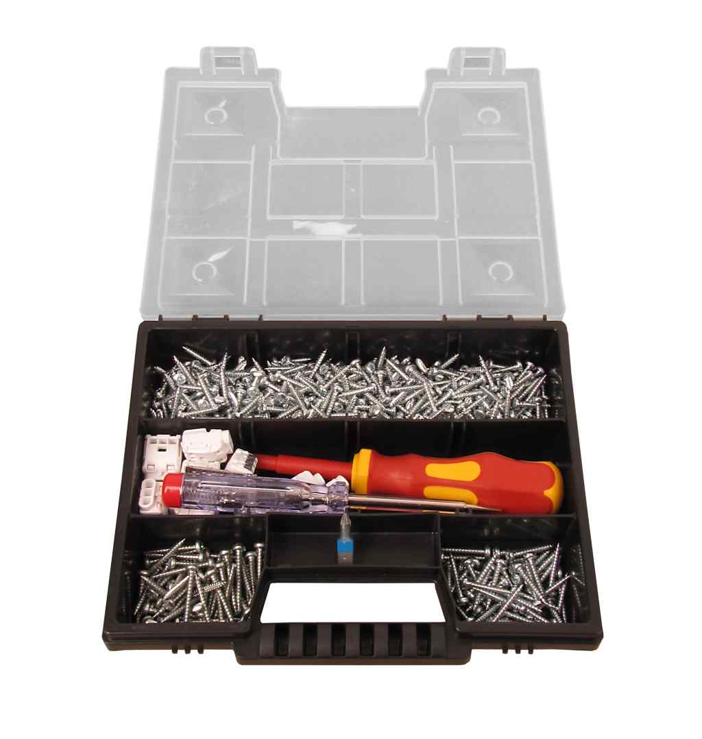 PROFI sada 500/1 - vruty pro upevnění domovních přístrojů a zásuvek do plastových elektroinstalačních krabic v praktickém balení. Sada obsahuje vysoce kvalitní vruty s plochou hlavou a povrchovou úpravou (zinkování) 3 nejčastěji používaných délek - 3x16 (400ks), 3x20 (50ks) a 3x25 (50ks) - hlava vrutů PZ1, samozřejmostí je ostrá špička. Součástí balení jsou i bezšroubové univerzální svorky SDKF 3 (10ks), bit PZ1 pro AKU šroubováky, šroubovák PZ1 a fázová zkoušečka 220-250V.