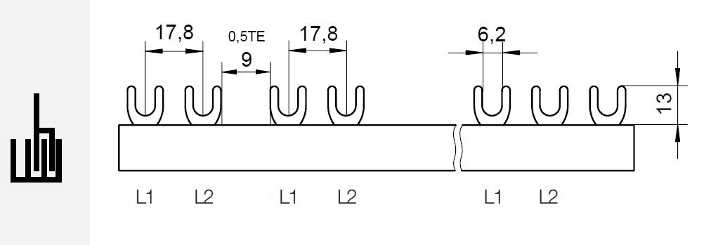 Prop. lišta G-2L+9-1000/16C, vidlička, 2pól., 80A, rozteč 17,8mm (2TE + mezera 0,5TE) *1000185 eleman