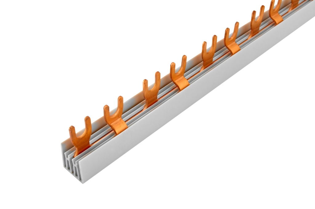 Prop. lišta G-2L+9-1000/16C, vidlička, 2pól., 80A, rozteč 17,8mm (2TE + mezera 0,5TE), 16mm2, 1m, přip. míst = 46, pro šroub M5-M6, C = vedená středem, koncovka EK-C-2+3/16.
