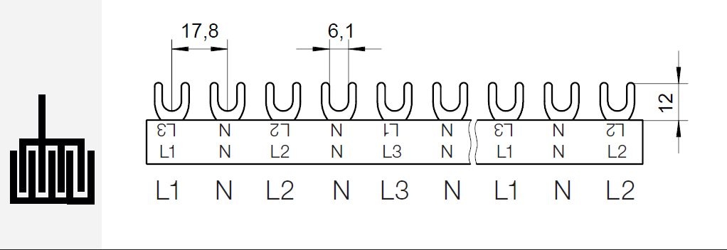 Prop. lišta G-L1+N-L2+N-L3+N-1000/16 P, vidlička, 4pól., 80A, rozteč 17,8mm *1000363 eleman