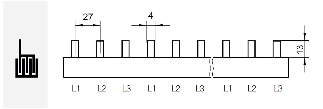 Prop. lišta S-3L-27-1000/16, kolík (jazýček), 3pól., 80A, rozteč 27mm, 16mm2, 1m, přip. míst = 36, rozteč 27mm (1mod.), koncovka EK-C-2+3/16.