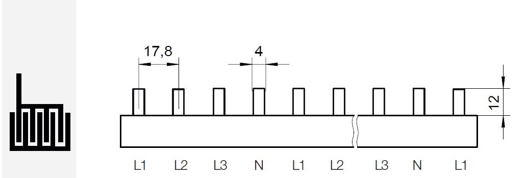 Prop. lišta S-4L-1000/16, kolík (jazýček), 4pól., 80A, rozteč 17,8mm, 16mm2, 1m, přip. míst = 56, rozměr kolíku 4x11,5mm, koncovka EK-C-4/16.