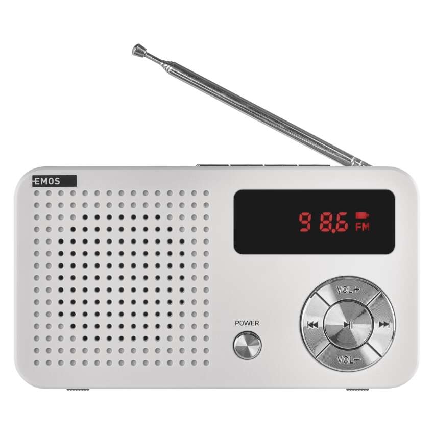 Rádio s mp3 EMOS EM-213 == anténa: teleskopická s kloubem|barva: bílá/šedá|bluetooth pro připojení např. telefonu, tabletu: ne|displej: LED|doba provozu na baterii: min. 10 hodin|dosah bluetooth: neuvádí se|frekvence tuneru: FM 88–108 MHz|frekvenční rozsah reproduktoru: neuvádí se|funkce budíku: ne|funkce handsfree: ne|hmotnost: 200 g|integrovaný mikrofon: ne|napájecí zdroj součástí dodávky: ne|napájení: 5 V/micro USB (napájecí zdroj není součástí balení)|odstup signálu/šum: >80 dB|podpora MP3: ano|potlačení signálu: neuvádí se|prodejní obal: 1 ks, krabice|rádio: ano|reproduktor: 50 mm/4 Ohm/3 W|rozměr: 125 × 30 × 70 mm|rozsah dekodéru MP3: 8–320 Kbps|typ baterie: Nokia BL-5C/400 mA|USB vstup: ano|verze bluetooth: neuvádí se|vstup AUX: ne|vstup pro microSD kartu: ano|výstup na sluchátka: ano