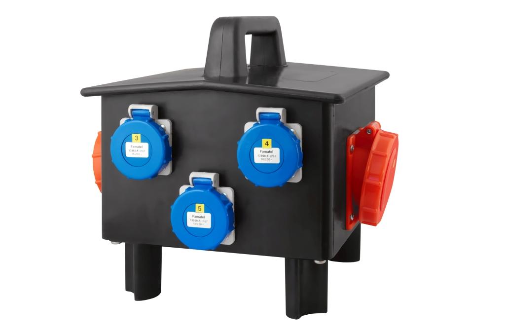 Zásuvková skříň FAMATEL rb55621 RB30002000.1 /4102 IP65 jištěná s chráničem 40/4/003, zásuvky 3x230V, 2x32/5, přístroje EATON 10kA: 3xPL7-B16/1, 1xPL7-B25/3, PF7-40/4/003 na vstupu, vidlice 32A/5 pól, 400V na gumovém kabelu 5G4 - 1m, použité pouzdro: 4102 - 290x270x270mm, barva pouzdra: černá, materiál: pryž (guma), rozměrová a tvarová stálost -20 až 85 st.C, zkouška žhavou smyčkou 960st. C, aplikované normy: IEC 61439-1, IEC-61439-3, EN 62208.