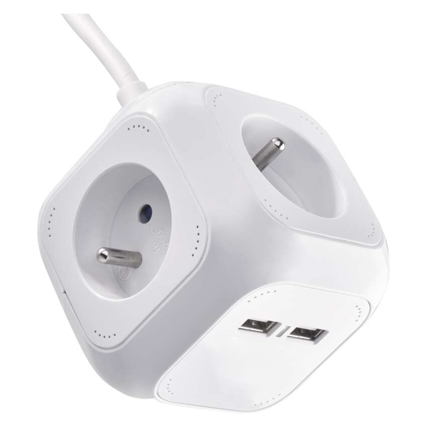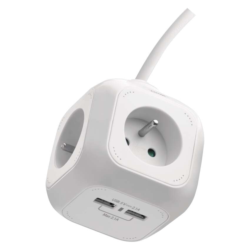 Prodlužovací kabel - kostka 1,9 m / 4 zásuvky / bílý / PVC / s USB / 1 mm2 == barva: bílá|délka: 1,9 m|dětské clonky: ano|krytí: IP20|materiál zásuvky a vidlice: plast|max. zátěž: 3 680 W|napětí: 250 V~|počet zásuvek: 4|prodejní obal: 1 ks, krabice|proud: 16 A max.|průřez vodiče: 1,0 mm?|typ izolace: PVC|USB výstup: 2× ? 2,1 A max. (10,5 W)|vodič: H05VV-F3G|vypínač: ne