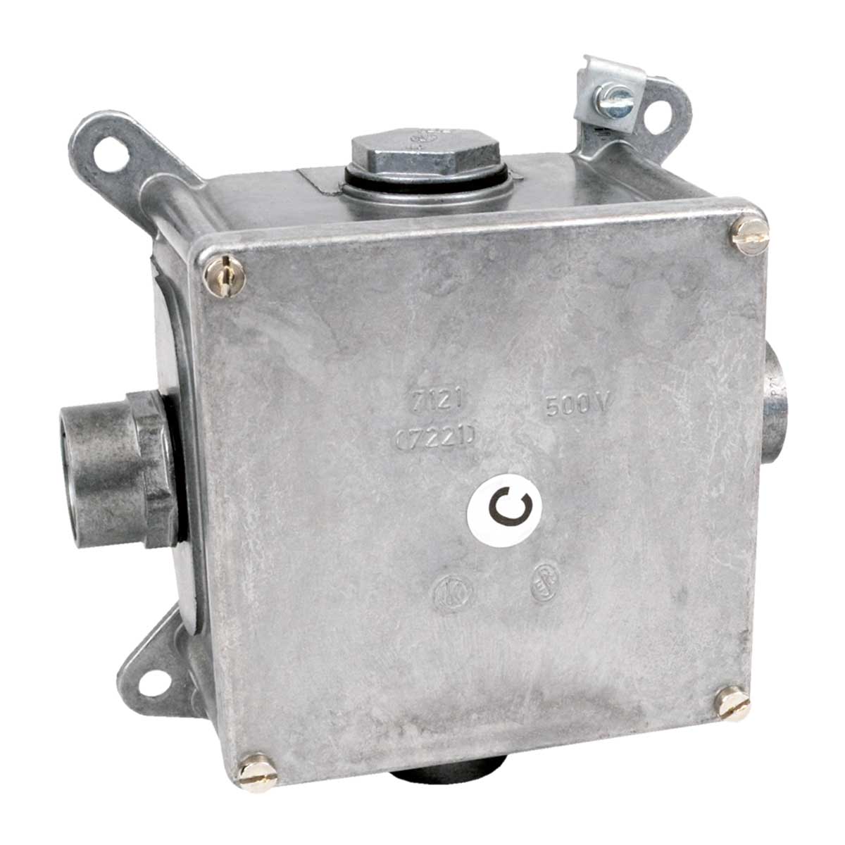 7121 C - KRABICE S IP KRYTÍM KOVOVÁ, konfigurace P21, barva KOV, balení - 1/12 ks  -  krabice pro rozvody s ocelovými závitovanými nebo kovovými ohebnými trubkami, 3 vývodky a jedna zátka rovnoměrně rozloženy na bocích krabice, svorkovnice není součástí krabice, bez ochranné svorky pro instalace v sítích TNC