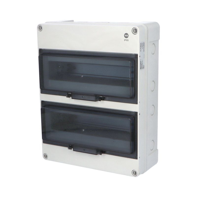Plastová rozvodnice FlatBOX 5926 ve vyšším krytí IP65, 2x12+2mod., rozměry: 340x270x120mm, svorkovnice PE/N součástí, montáž na omítku, průhledné okénko, barva: světle šedá.