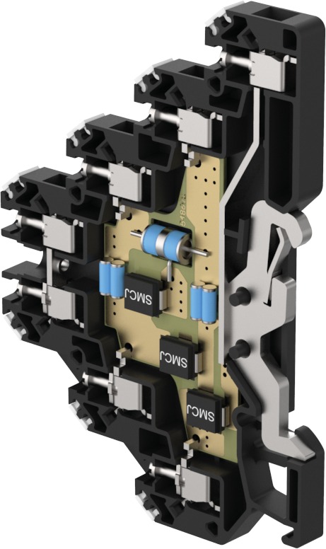 Saltek DM-024/1-RS přepěťová ochrana dvoužilových signálových linek, instalace těsně před chráněné zařízení, šroubová řadová svorka, 24 V DC, do 0,5 A