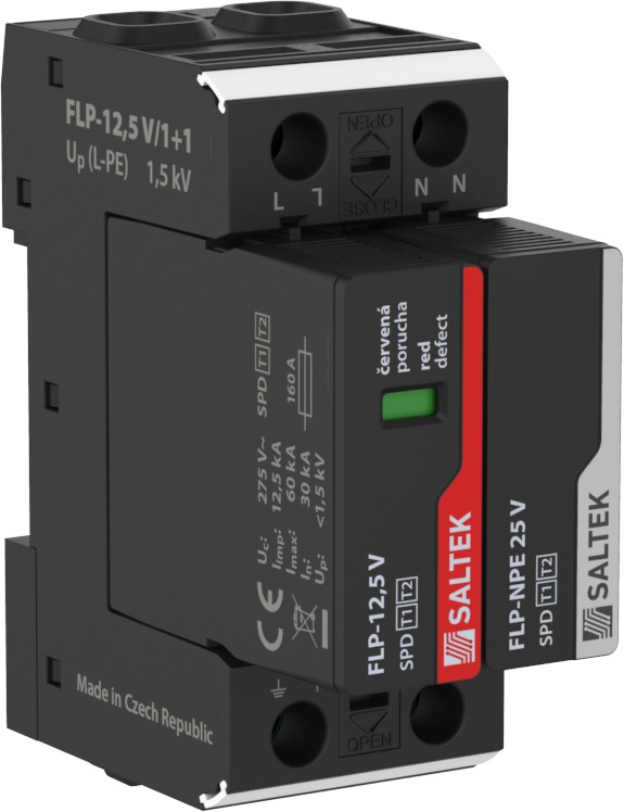 Saltek FLP-12,5 V/1+1 svodič bleskových proudů a přepětí, vhodné pro 1-fázový systém TT, instalace na vstupu do budovy, 60 kA(8/20), 25 kA (10/350)