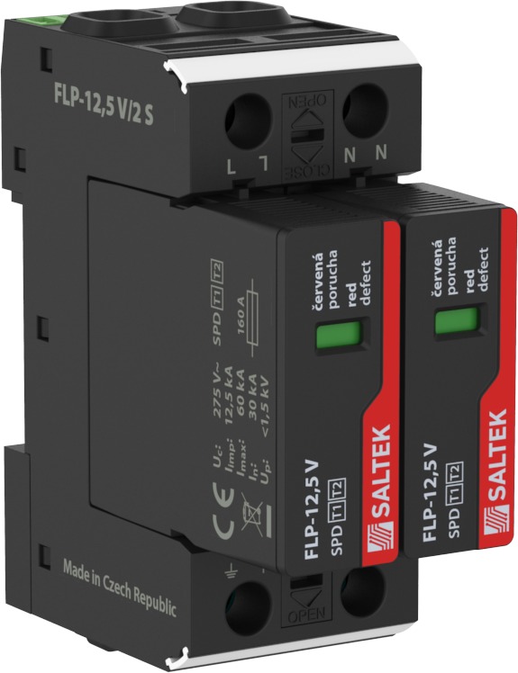 Saltek FLP-12,5 V/2 S svodič bleskových proudů a přepětí, vhodné pro  1-fázový  systém TN-S, instalace na vstupu do budovy, 120 kA(8/20), 25 kA (10/350), dálková signalizace poruchy