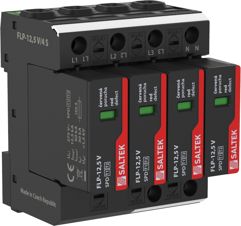 Saltek FLP-12,5 V/4 S svodič bleskových proudů a přepětí, vhodné pro  3-fázový  systém TN-S, instalace na vstupu do budovy, 240 kA(8/20), 50 kA (10/350), dálková signalizace poruchy