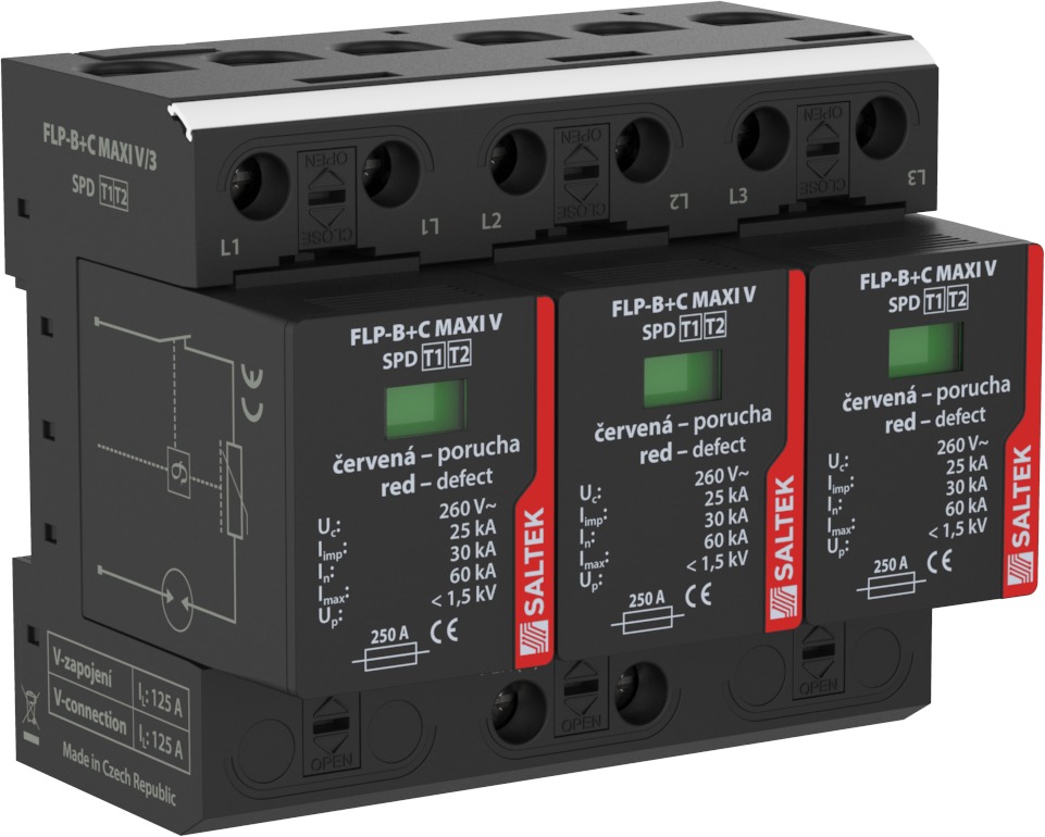 Saltek FLP-B+C MAXI V/3 kombinovaný svodič bleskových proudů a přepětí, vhodné pro 3-fázový systém TN-C, instalace na vstupu do budovy, 75 kA (10/350), 180 kA (8/20)