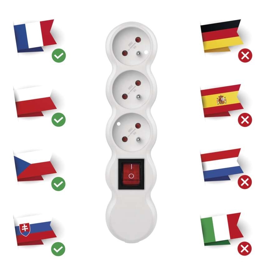 Samostatná 3 zásuvka s vypínačem, bílá == barva: bílá|dálkový ovladač: ne|dětské clonky: ano|dosah signálu: neuvádí se|easy learning: ne|krytí: IP20|materiál: plast|max. zátěž: neuvádí se|možnost ovládání: ne|napětí/proud: 250 V~/16 A max.|počet pólů: neuvádí se|počet zásuvek: 3× 2P + PE|pozice ochranného kontaktu: neuvádí se|přenosoná frekvence: ne|prodejní obal: 1 ks, závěs|produkt: zásuvkové pole – připojení pomocí svorkovnice|typ: FRENCH|venkovní použití: ne|vypínač: ano