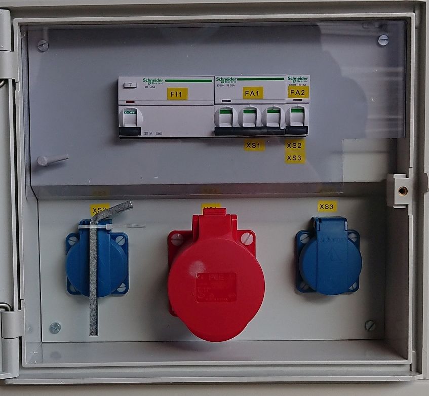 přístrojová výzbroj : proudový chránič, můstek PE, 1x zásuvka 380V 16A/3 (5-pólová), 2x zásuvka 230V 16A
