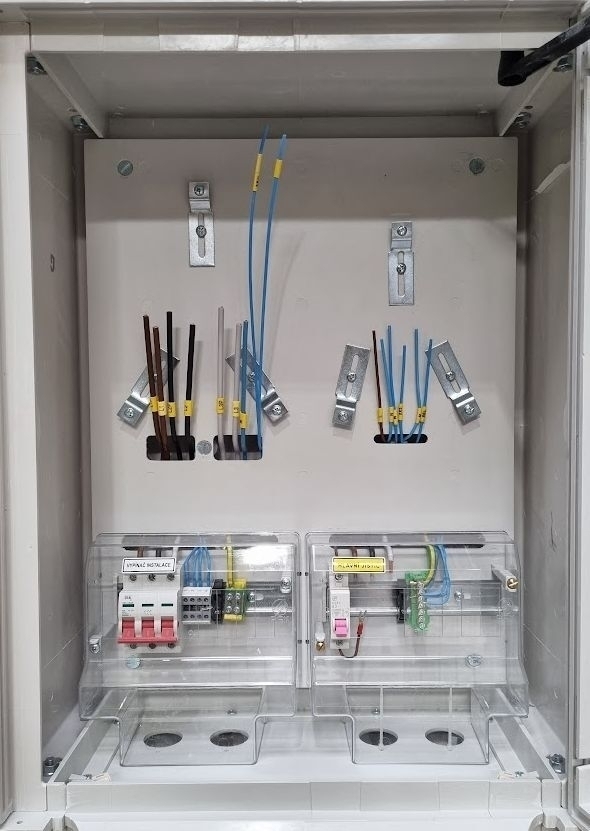 Typ : elektroměrový rozvaděč pro 1 elektroměr + vypínač 63A+ příprava na FV + zásuvková rozvodnice 2x230V+1x400V/16A/5p jištěné