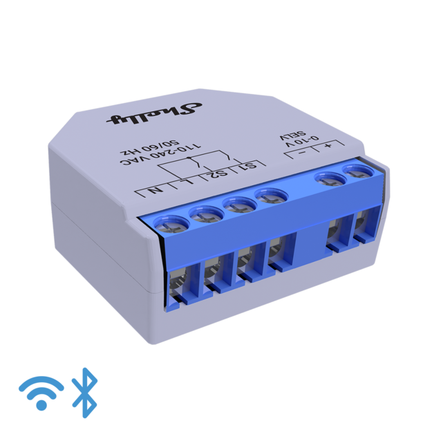 Stmívač SHELLY Dimmer 0/1-10V PM Gen3 podpora pro typy ovladačů 0-10V a 1-10V, 110-240V, paměť 8MB, WiFi, Bluetooth.
