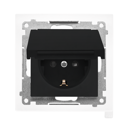 Simon 55 TGSZ1BCZ.01/149 Zásuvka Schuko 1 násobná (přístroj s krytem), IP44 s uzemněním, se clonkami, s těsněním rámečku, víčko v barvě krytu, 16 A / 250 V~, bezšroubové svorky černá matná