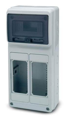 Plastová skříň AcquaCOMBI 3967 s 2 otvory pro umístění zásuvek, ve vyšším krytí IP65, 8mod., rozměry: 500x230x155mm, montáž na omítku, průhledná dvířka, barva: světle šedá.