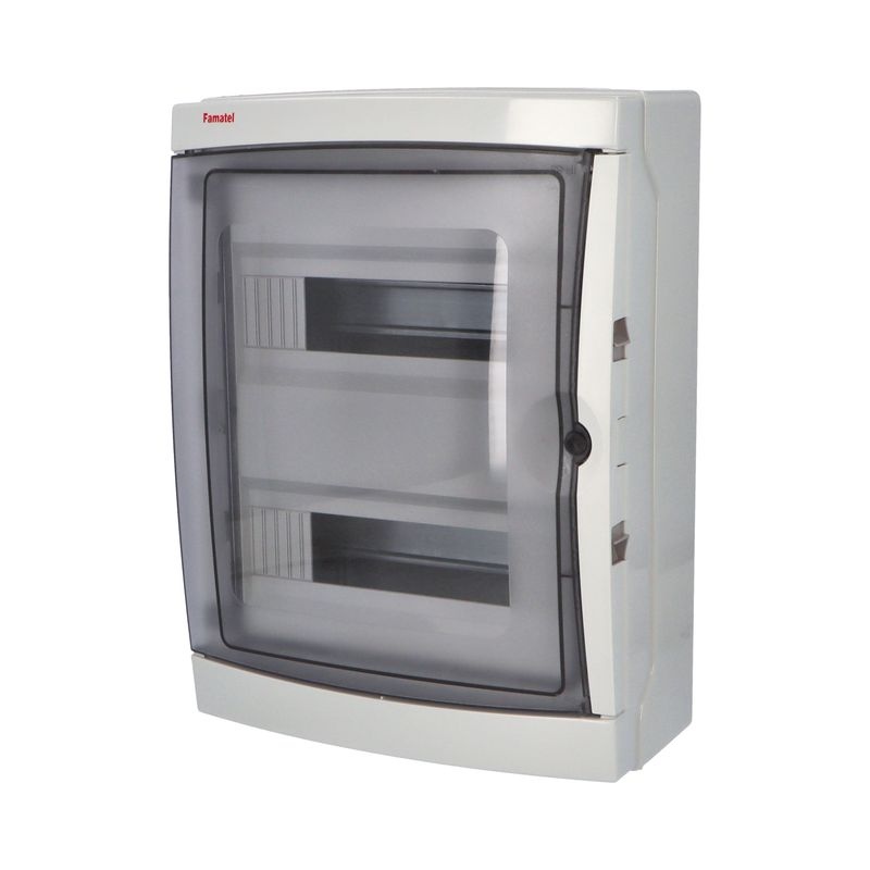 Plastová rozvodnice Acqua 3926-TTB ve vyšším krytí IP65, 26mod., rozměry: 410x310x150mm, svorkovnice PE/N součástí, montáž na omítku, průhledná dvířka, barva: světle šedá.