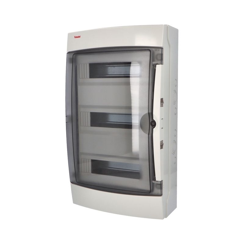 Plastová rozvodnice Acqua 3942-TTB ve vyšším krytí IP65, 42mod., rozměry: 565x326x150mm, svorkovnice PE/N součástí, montáž na omítku, průhledná dvířka, barva: světle šedá.