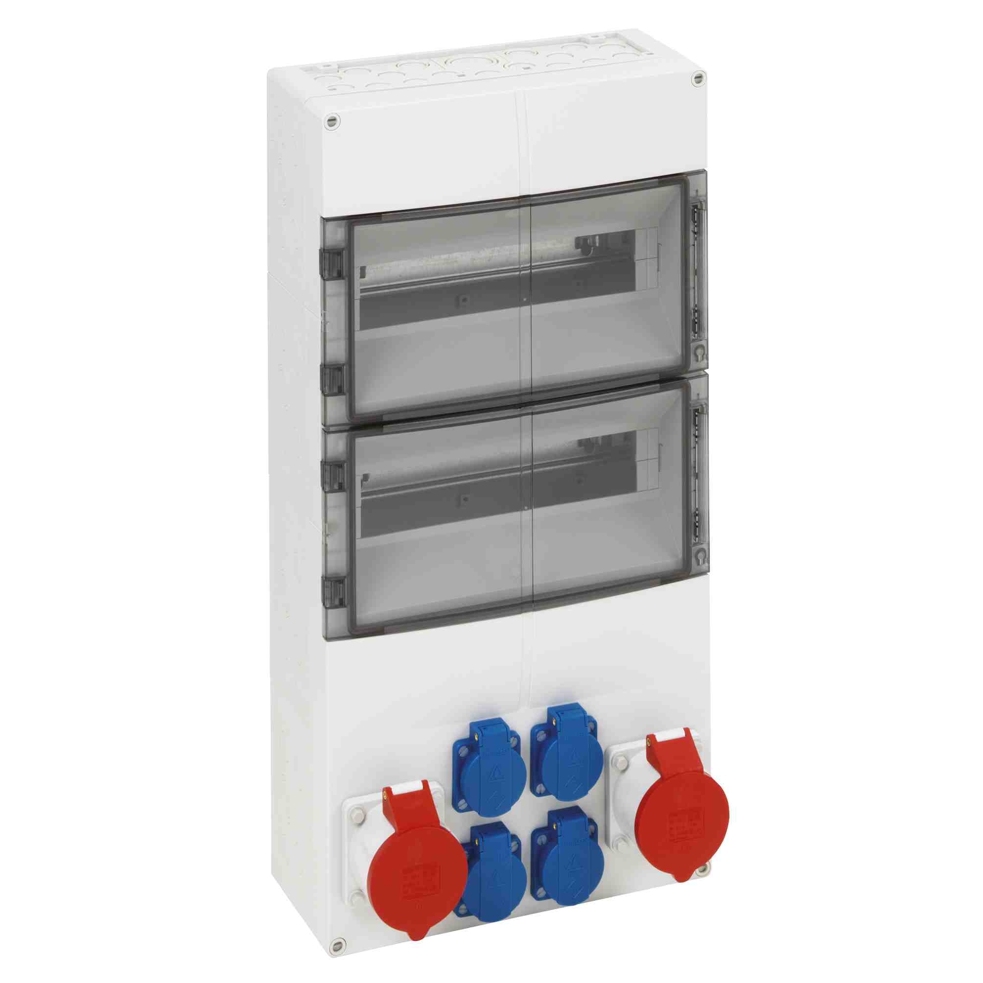Zásuvková kombinace, se stupněm krytí IP44, vhodná k montáži řadových vestavných přístrojů zákazníkem, se zabudovanými zásuvkami, předběžně zapojenými do svorek PE/N, vysoká mechanická zatížitelnost, odolná vůči extrémním teplotám, kombinovatelná, bez halogenů, Dostupné moduly: 28 vybaveny: 4 x SCHUKO® zásuvka (na přední straně), 230 V 2 x Zásuvka CEE (na přední straně) 32 A, 400 V  Rozměry: 300 x 600 x 142 mm Přiložené příslušenství: Dvojitá membránová vývodka: 1x M20, 1x M25, 1x M32, Vývodka: 1x M40, Zaslepovací zátky, Krycí a popisovací pásky