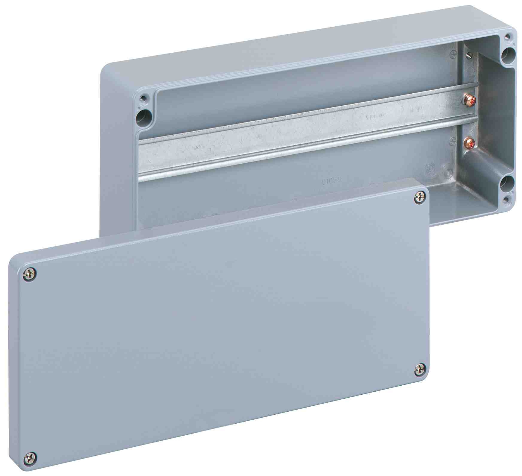 Skříň pro řadové svorkovnice, se stupněm krytí IP66, Jmenovitý průřez 4 mm?, Ui=400V AC, Hliník s práškovým lakováním, Vnitřní místa pro připevnění, pro instalace v průmyslovém prostředí a chráněném venkovním prostředí, bez svorek, s nosnou lištou NS35 Rozměry: 360 x 160 x 91 mm