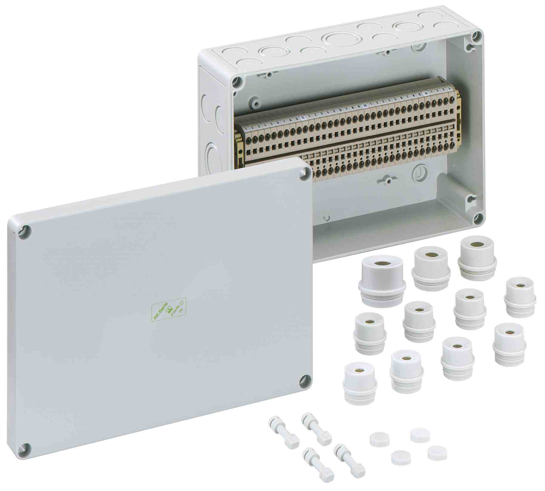 Skříň pro řadové svorkovnice, se stupněm krytí IP54/IP66, Jmenovitý průřez 4 mm?, Ui=400V AC, polystyren, Vnitřní místa pro připevnění, pro standardní instalace ve vnitřním prostoru, osazené 34 bezšroubovými svorkami 4 mm? (typ Weidmüller ZDU 4) Rozměry: 254 x 180 x 90 mm Přiložené příslušenství: 8 Vývodka IP54 M20 Rozsah těsnění 8 - 13,5 mm, 2 Vývodka IP54 M25 Rozsah těsnění 9 - 18,5 mm, 1 Vývodka IP54 M32 Rozsah těsnění 13 - 23 mm
