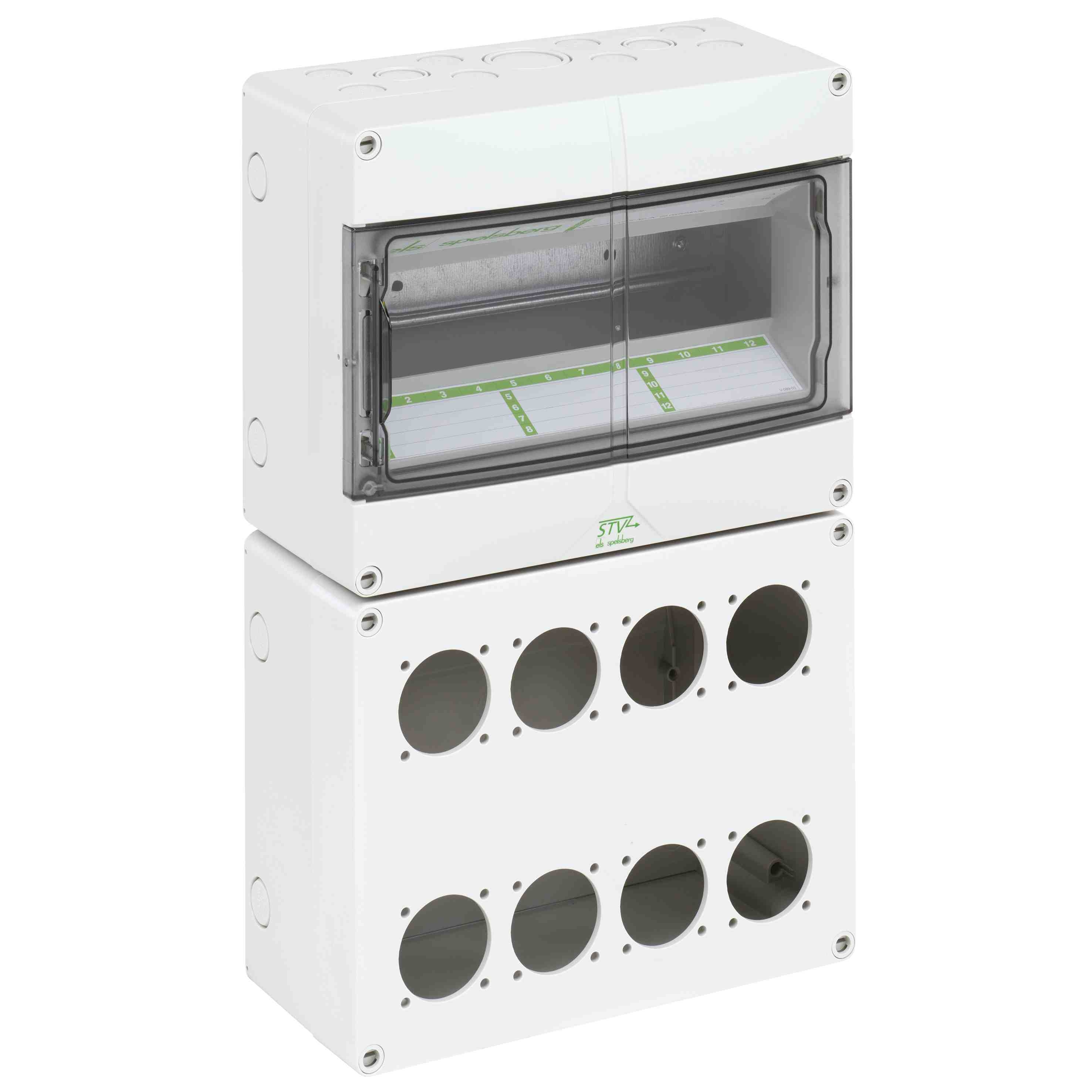 Prázdná zásuvková skříň, se stupněm krytí IP44, vhodná k montáži řadových vestavných přístrojů a připojovacích zásuvek zákazníkem, vč. svorky PE/N a adaptérů a šroubů k montáži zásuvek, vysoká mechanická zatížitelnost, odolná vůči extrémním teplotám, kombinovatelná, bez halogenů, Dostupné moduly: 12 Otvory pro zásuvky: 8x otvor pro zásuvku SCHUKO® o průměru 44,5 mm a roztečí vývrtů pro montáž svisle / vodorovně 38/38 mm (čelně) Rozměry: 250 x 400 x 122 mm Přiložené příslušenství: Vývodka: 2x M25, 2x M32, Zaslepovací zátky, Krycí a popisovací pásky