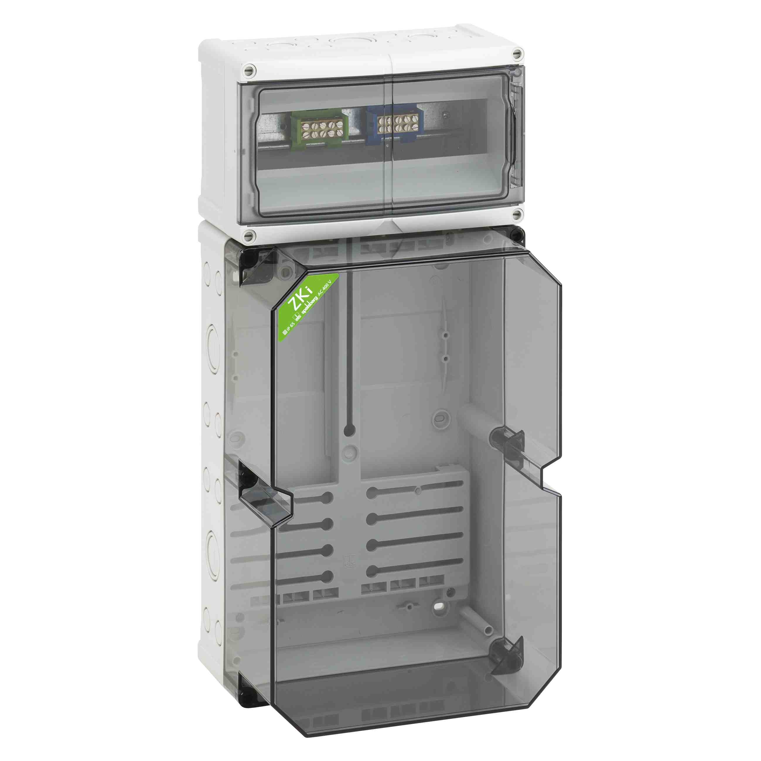 Skříň elektroměru - průmyslová kvalita -, s transparentním víkem, sériově plombovatelné, s namontovaným elektroměrovým křížem a připevňovacími šrouby elektroměru, sériově plombovatelný spotřebitelský prostor nahoře, s 35mm DIN lištou a dvojitou svorkou PE/N, s hrdlem s dvojitou membránou, Zaslepovací zátka a izolační krytka, pro třífázové elektroměry Rozměry: 250 x 520 x 193 mm