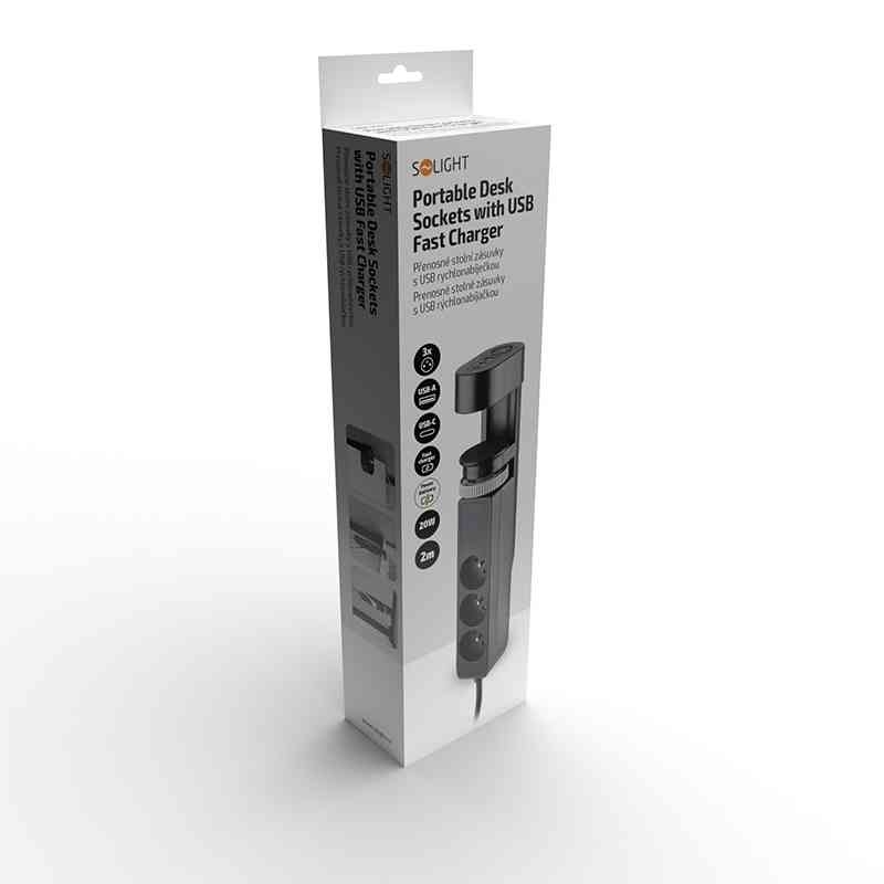 Solight 3z + USB A+C přenosné stolní zásuvky, 2m, černá, USB rychlonabíječka 20W PD *PP105C-PD20-B