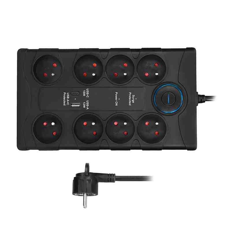 Solight přepěťová ochrana, 8z, USB A+CA, 2m, černá *PO80B