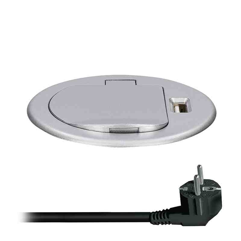 Solight USB vestavná zásuvka s víčkem, 1 zásuvka, plast, délka 1,5m, 3x 1mm2, USB 2100mA, stříbrná *PP122