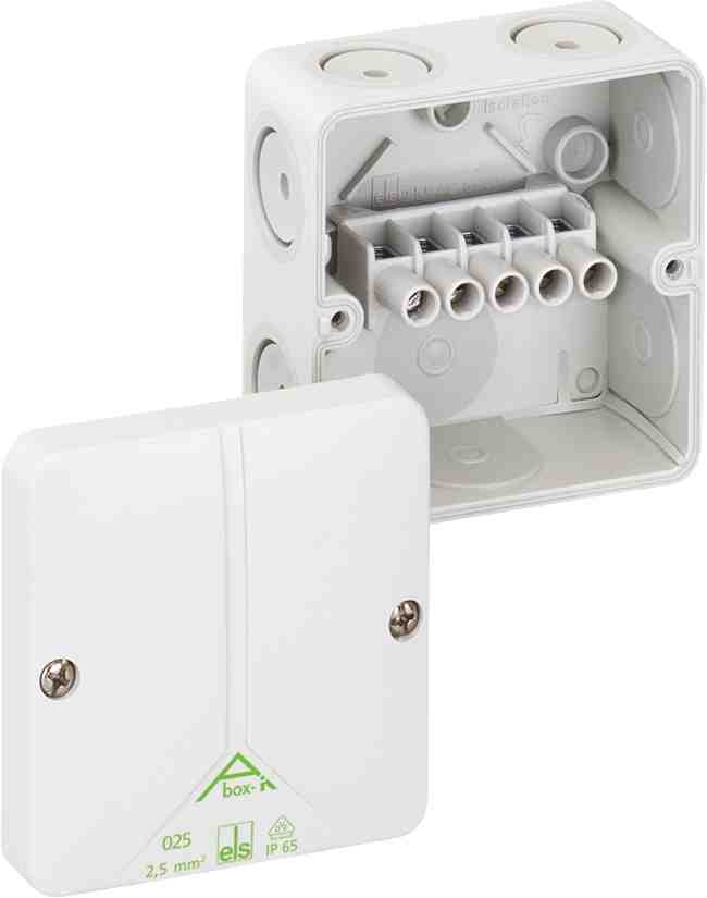 Rozbočovací krabice, se stupněm krytí IP65, Jmenovitý průřez 2,5 mm?, Ui=690V AC, Certifikováno VDE (DIN EN 60670-1/-22 (VDE 0606-1/-22)), DLG (odolnost vůči čpavku), DNV (Třída: Lodě & offshore zařízení), Samotěsnicí měkká přívodní membrána, M20, Rozsah těsnění 2 - 16 mm, (1 Zpětné, 7 bočně), Vnitřní místa pro připevnění, pro instalace v průmyslovém prostředí a chráněném venkovním prostředí, šedá, s šroubovou svorkou, 5-pólovou - 2,5 mm? (4 x 1,5? / 4 x 2,5?) Rozměry: 80 x 80 x 52 mm