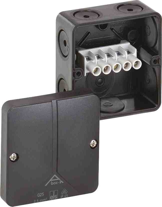Rozbočovací krabice, se stupněm krytí IP65, Jmenovitý průřez 2,5 mm?, Ui=690V AC, Certifikováno VDE (DIN EN 60670-1/-22 (VDE 0606-1/-22)), DLG (odolnost vůči čpavku), DNV (Třída: Lodě & offshore zařízení), Samotěsnicí měkká přívodní membrána, M20, Rozsah těsnění 2 - 16 mm, (1 Zpětné, 7 bočně), Vnitřní místa pro připevnění, pro instalace v průmyslovém prostředí a chráněném venkovním prostředí, černá, s šroubovou svorkou, 5-pólovou - 2,5 mm? (4 x 1,5? / 4 x 2,5?) Rozměry: 80 x 80 x 52 mm