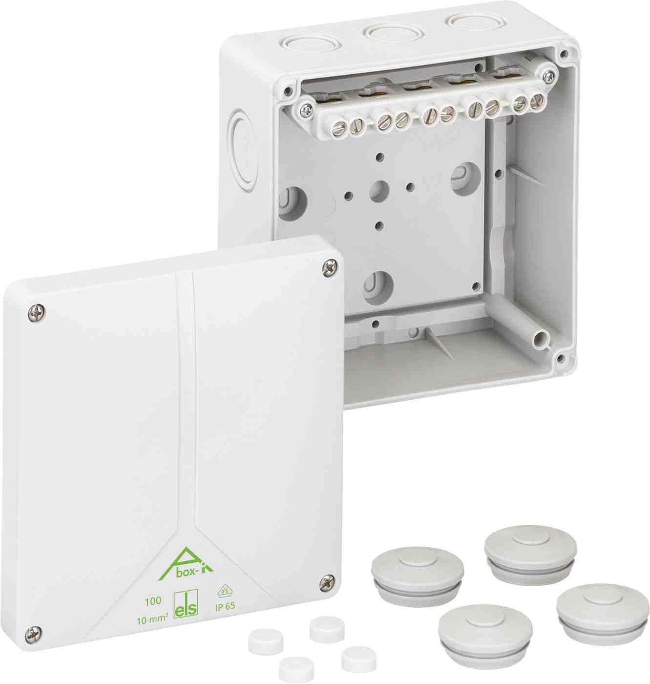 Rozbočovací krabice, se stupněm krytí IP65, Jmenovitý průřez 10 mm?, Ui=690V AC, Certifikováno VDE (DIN EN 60670-1/-22 (VDE 0606-1/-22)), DLG (odolnost vůči čpavku), DNV (Třída: Lodě & offshore zařízení), Vyrážecí membrány, M20/M25/M32, (2 Zpětné, 10 bočně), Vnitřní místa pro připevnění, pro instalace v průmyslovém prostředí a chráněném venkovním prostředí, šedá, s vysoko položenou šroubovou svorkou, 5-pólovou - 10 mm? (4 x 4? / 4 x 6? / 4 x 10?) Rozměry: 140 x 140 x 79 mm Přiložené příslušenství: 4Dvojitá membránová vývodka IP66 M32 Rozsah těsnění 14 - 21 mm