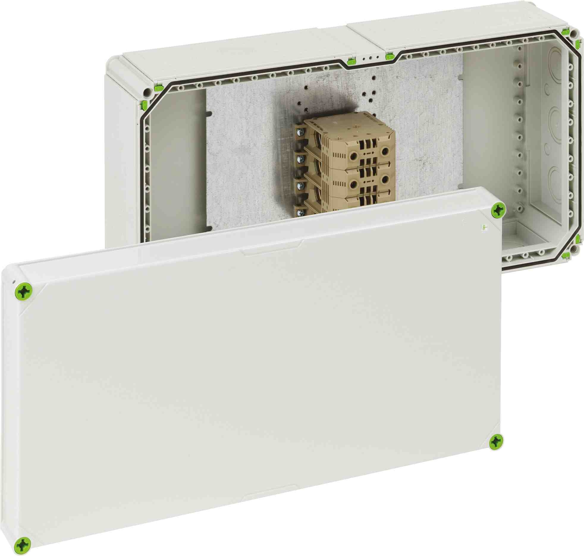 Rozbočovací krabice, se stupněm krytí IP65, Jmenovitý průřez 240 mm?, Ui=690V AC, Vyrážecí membrány, M16/M40/M50, (30 bočně), Vnitřní místa pro připevnění, pro instalace v průmyslovém prostředí a chráněném venkovním prostředí, šedá, s řadovou svorkovnicí 4-pólovou - 240? (70 až 240 mm?) Rozměry: 640 x 320 x 179 mm