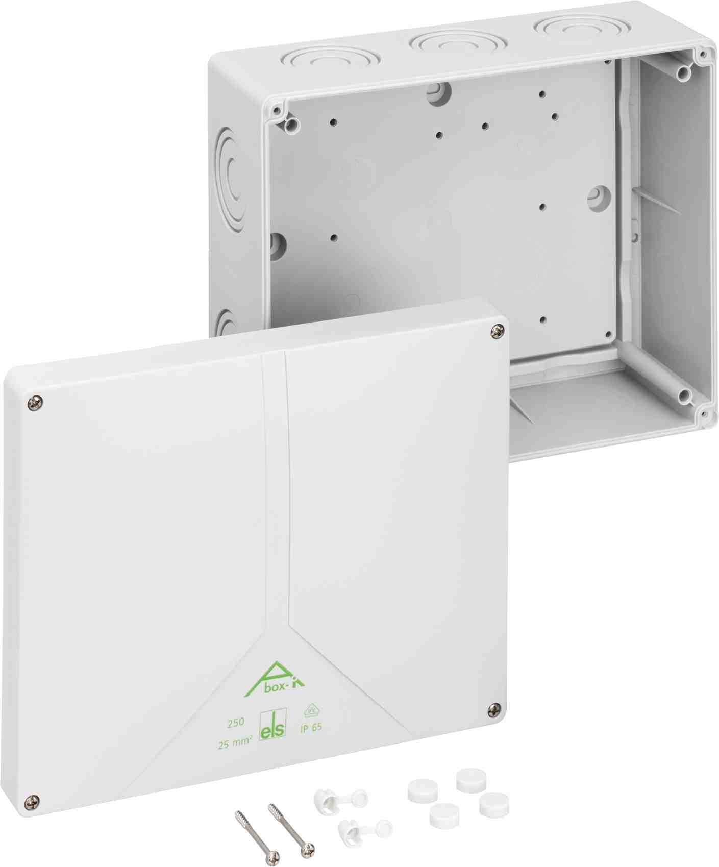 Rozbočovací krabice, se stupněm krytí IP65, Jmenovitý průřez 25 mm?, Ui=690V AC, Certifikováno VDE (DIN EN 60670-1/-22 (VDE 0606-1/-22)), DLG (odolnost vůči čpavku), DNV (Třída: Lodě & offshore zařízení), Vyrážecí membrány, M20/M25/M32/M40/M50, (4 Zpětné, 10 bočně), Vnitřní místa pro připevnění, pro instalace v průmyslovém prostředí a chráněném venkovním prostředí, šedá, bez svorek Rozměry: 250 x 200 x 115 mm Přiložené příslušenství: 1 Plombovací souprava