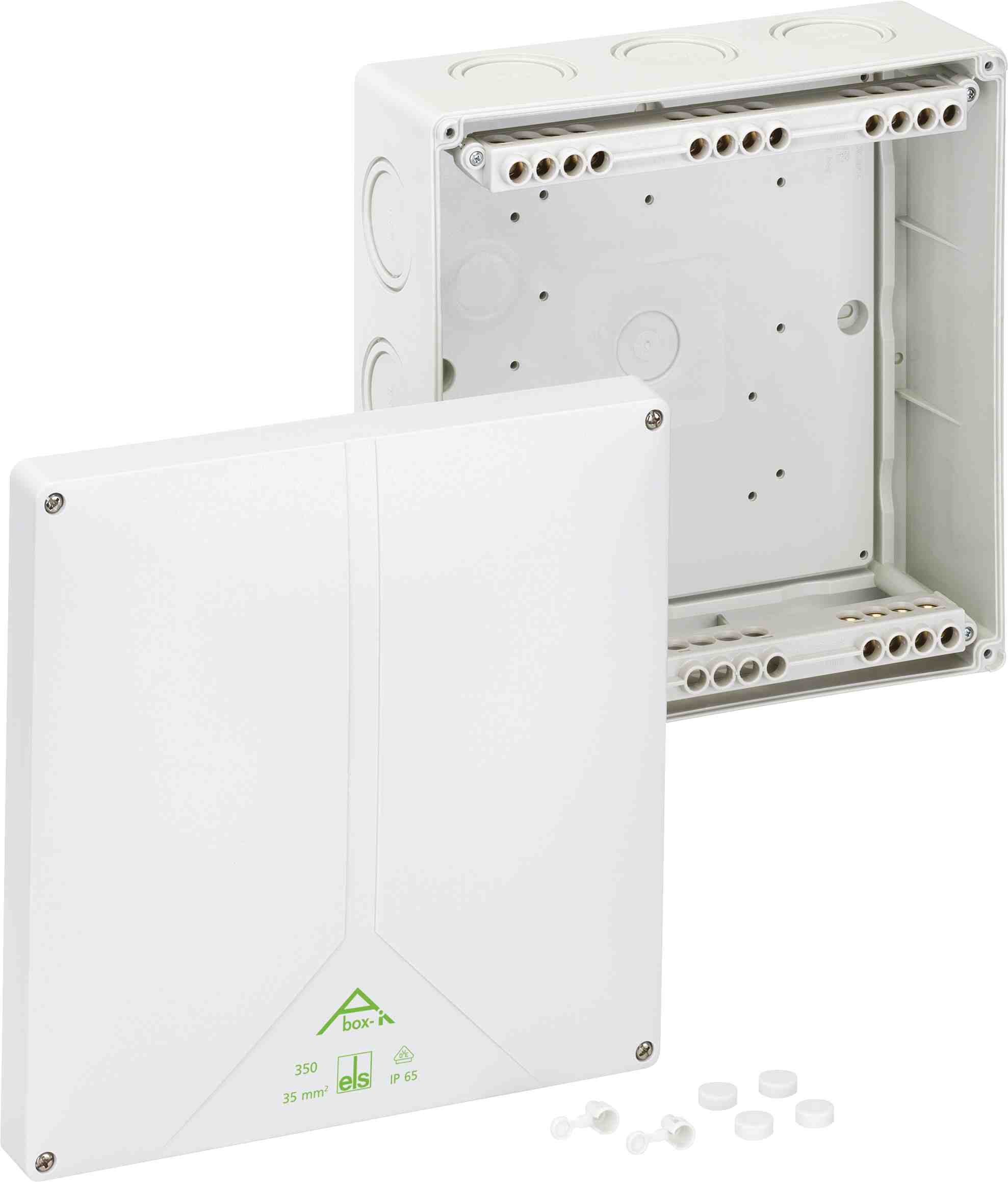Rozbočovací krabice, se stupněm krytí IP65, Jmenovitý průřez 35 mm?, Ui=690V AC, Certifikováno VDE (DIN EN 60670-1/-22 (VDE 0606-1/-22)), DLG (odolnost vůči čpavku), DNV (Třída: Lodě & offshore zařízení), Vyrážecí membrány, M25/M32/M40/M50, (2 Zpětné, 12 bočně), Vnitřní místa pro připevnění, pro instalace v průmyslovém prostředí a chráněném venkovním prostředí, šedá, s vysoko položenými šroubovými svorkami, 5-pólovými - 35 mm? (4 x 10? / 4 x 16? / 4 x 25? / 4 x 35?) Rozměry: 250 x 250 x 115 mm Přiložené příslušenství: 1 Plombovací souprava
