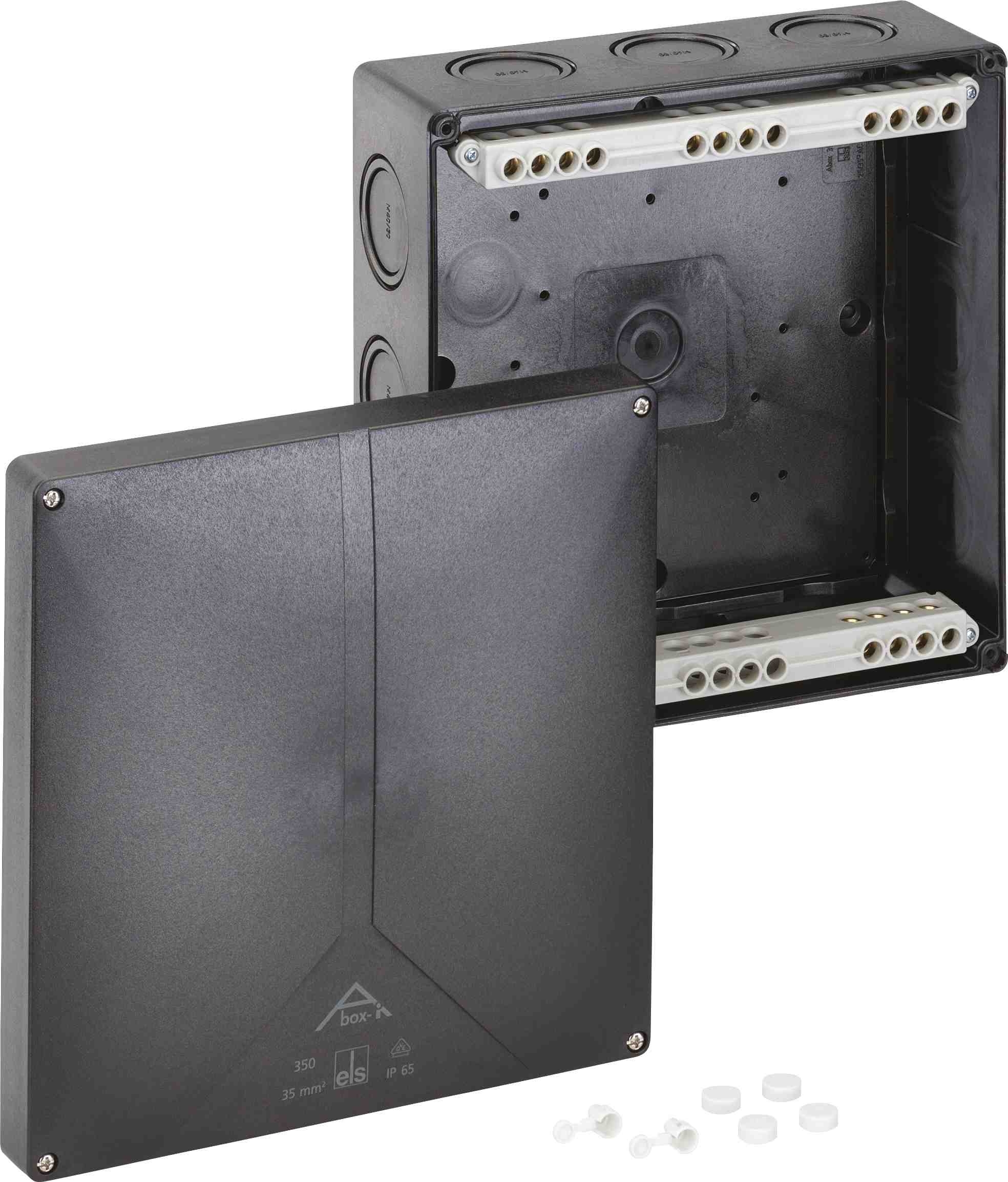Rozbočovací krabice, se stupněm krytí IP65, Jmenovitý průřez 35 mm?, Ui=690V AC, Certifikováno VDE (DIN EN 60670-1/-22 (VDE 0606-1/-22)), DLG (odolnost vůči čpavku), DNV (Třída: Lodě & offshore zařízení), Vyrážecí membrány, M25/M32/M40/M50, (2 Zpětné, 12 bočně), Vnitřní místa pro připevnění, pro instalace v průmyslovém prostředí a chráněném venkovním prostředí, černá, s vysoko položenými šroubovými svorkami, 5-pólovými - 35 mm? (4 x 10? / 4 x 16? / 4 x 25? / 4 x 35?) Rozměry: 250 x 250 x 115 mm Přiložené příslušenství: 1 Plombovací souprava