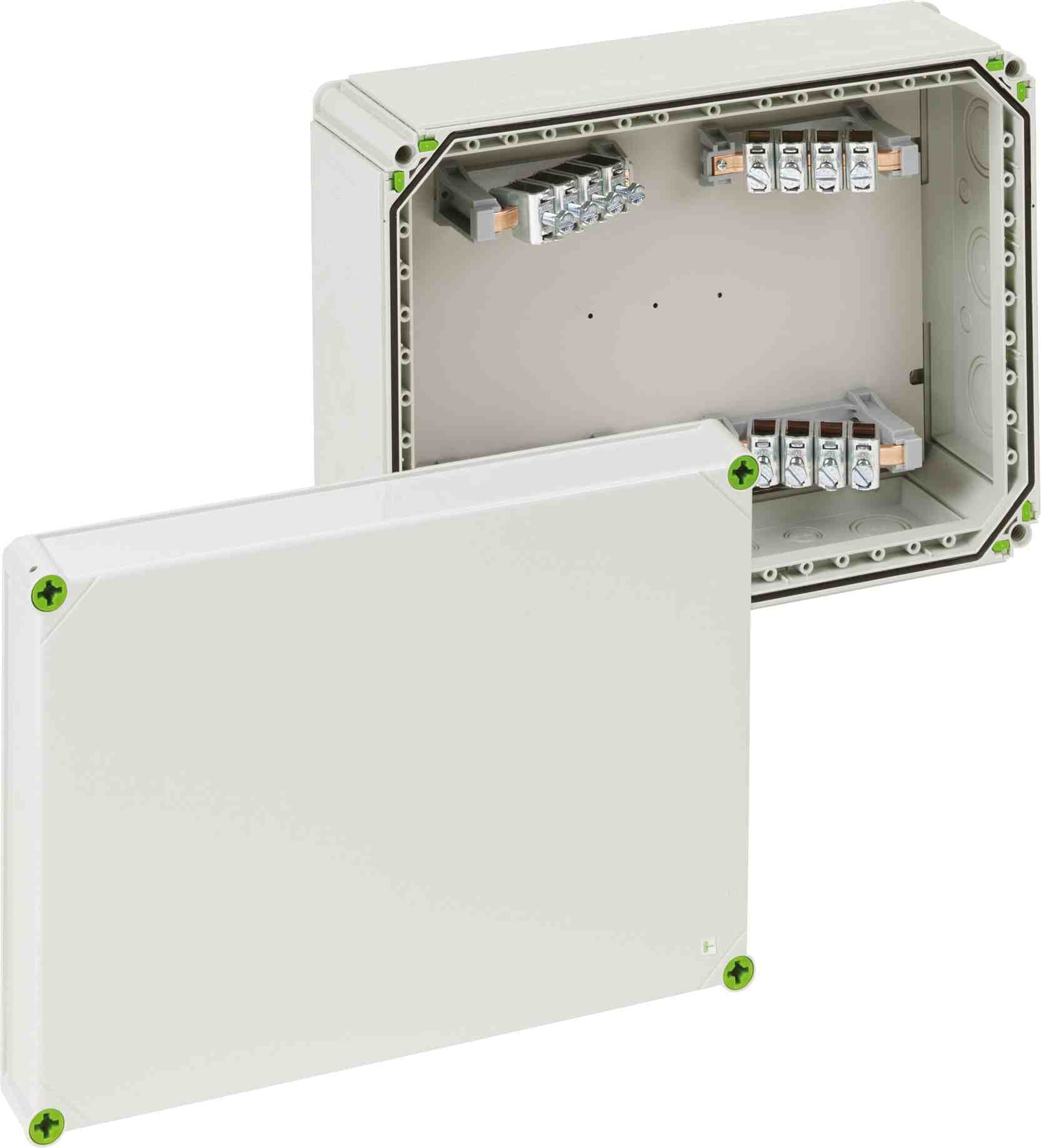 Rozbočovací krabice, se stupněm krytí IP65, Jmenovitý průřez 70 mm?, Ui=690V AC, Vyrážecí membrány, M16/M20/M25/M32/M40/M50, (24 bočně), Vnitřní místa pro připevnění, pro instalace v průmyslovém prostředí a chráněném venkovním prostředí, šedá, s šroubovou svorkou, 4-pólovou - 70? (16-70?) Rozměry: 440 x 320 x 179 mm