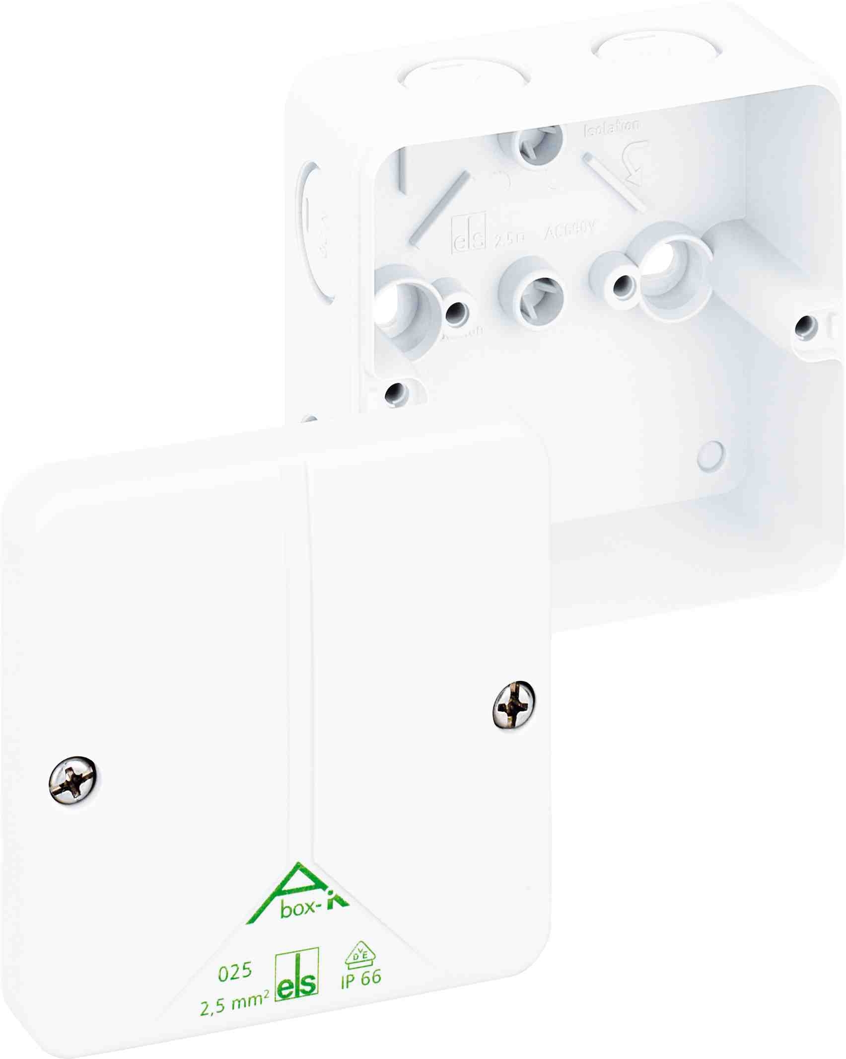 Rozbočovací krabice, se stupněm krytí IP66, Jmenovitý průřez 2,5 mm?, Ui=690V AC, Certifikováno VDE (DIN EN 60670-1/-22 (VDE 0606-1/-22)), DLG (odolnost vůči čpavku), DNV (Třída: Lodě & offshore zařízení), Vyrážecí membrány, M20, (1 Zpětné, 7 bočně), Vnitřní místa pro připevnění, pro instalace v průmyslovém prostředí a chráněném venkovním prostředí, bílá Rozměry: 82 x 82 x 52 mm Přiložené příslušenství: 4Dvojitá membránová vývodka IP66 M20 Rozsah těsnění 7 - 12 mm