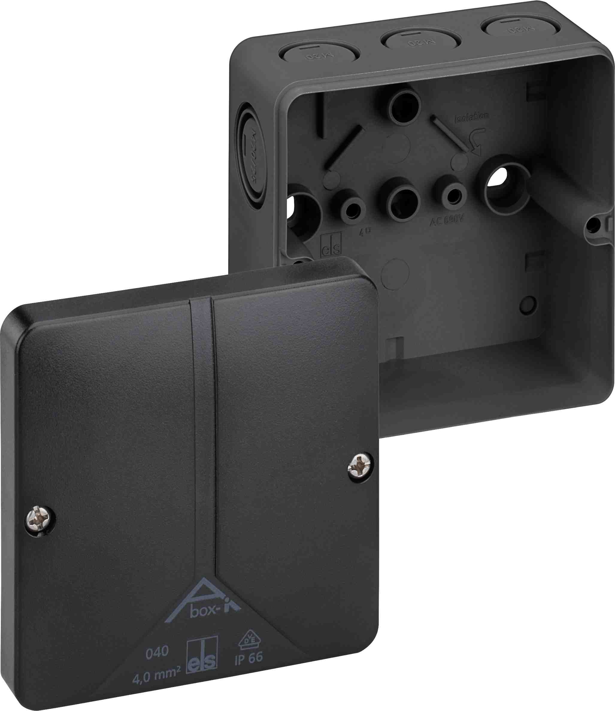Rozbočovací krabice, se stupněm krytí IP66, Jmenovitý průřez 4 mm?, Ui=690V AC, Certifikováno VDE (DIN EN 60670-1/-22 (VDE 0606-1/-22)), DLG (odolnost vůči čpavku), DNV (Třída: Lodě & offshore zařízení), Vyrážecí membrány, M20/M25, (1 Zpětné, 8 bočně), Vnitřní místa pro připevnění, pro instalace v průmyslovém prostředí a chráněném venkovním prostředí, černá, bez svorek Rozměry: 94 x 94 x 57 mm Přiložené příslušenství: 4Dvojitá membránová vývodka IP66 M25 Rozsah těsnění 9 - 16 mm
