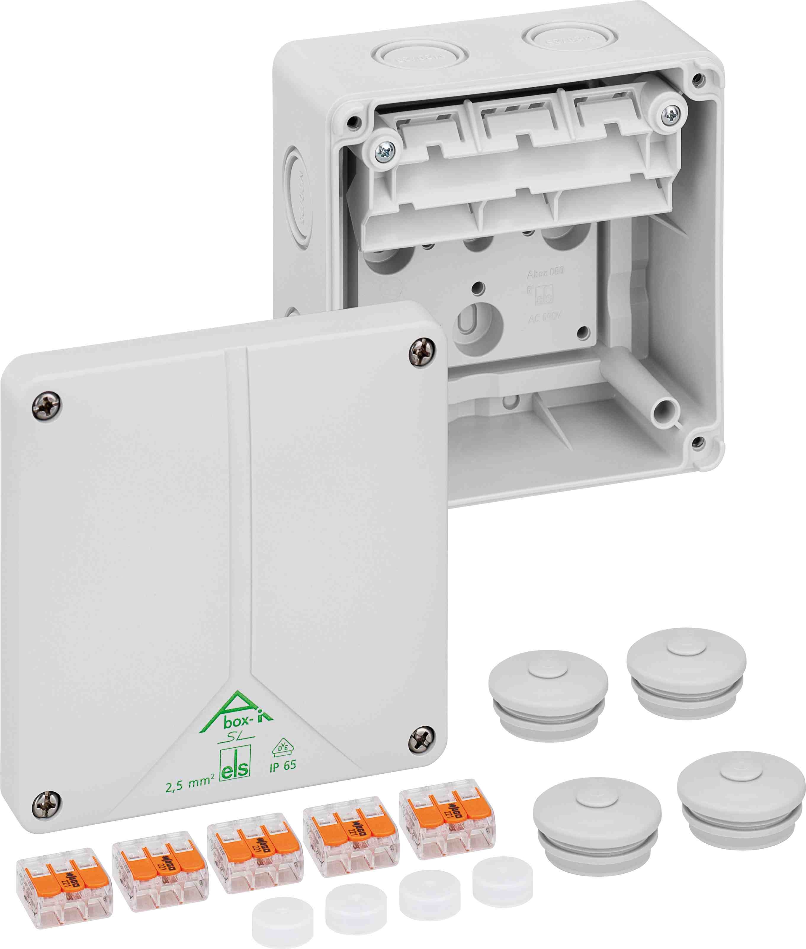 Rozbočovací krabice, se stupněm krytí IP65, Jmenovitý průřez 4 mm?, Ui=450V AC, Certifikováno VDE (DIN EN 60670-1/-22 (VDE 0606-1/-22)), DLG (odolnost vůči čpavku), Vyrážecí membrány, M20/M25, (2 Zpětné, 7 bočně), Vnitřní místa pro připevnění, s bezšroubovými svorkami pro instalace v průmyslovém prostředí a chráněném venkovním prostředí, šedá, s 5 vysoko položenými, bezšroubovými 3-vodičovými svorkami Wago 221-413, max. jmenovitý průřez podle DIN EN 60998: 4 mm?, při proudové zatížitelnosti 24 A, svorkovatelné průřezy na pól: 3 x 0,2 až 4 mm? pevné a 3 x 0,14 až 4,0 mm? flexibilní Rozměry: 110 x 110 x 67 mm Přiložené příslušenství: 4Dvojitá membránová vývodka IP66 M25 Rozsah těsnění 9 - 16 mm