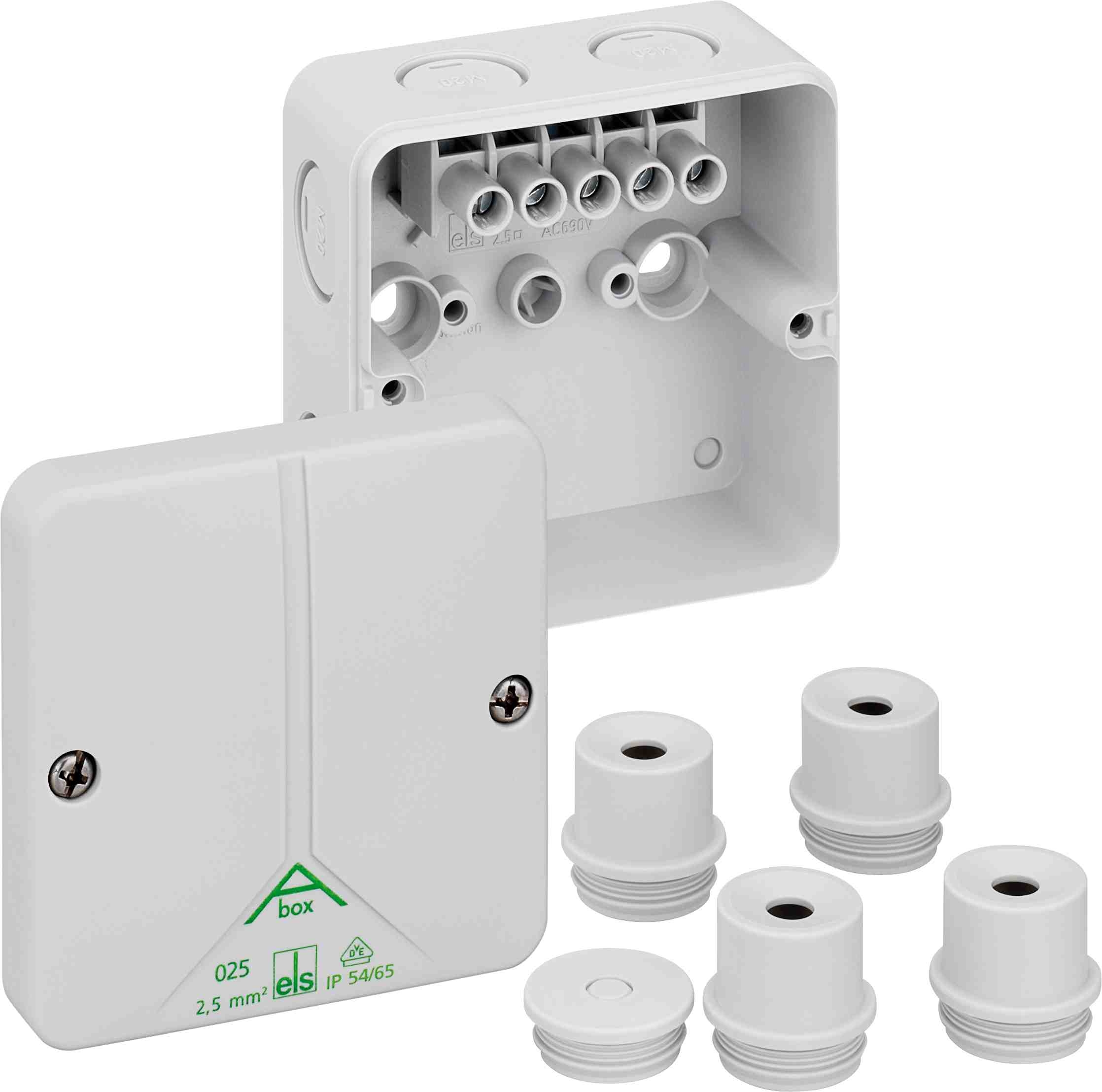 Rozbočovací krabice, se stupněm krytí IP54/IP65, Jmenovitý průřez 2,5 mm?, Ui=690V AC, Certifikováno VDE (DIN EN 60670-1/-22 (VDE 0606-1/-22)), Vyrážecí membrány, M20, (1 Zpětné, 7 bočně), Vnitřní místa pro připevnění, pro standardní instalace ve vnitřním prostoru, šedá, s šroubovou svorkou, 5-pólovou - 2,5 mm? (4 x 1,5? / 4 x 2,5?) Rozměry: 82 x 82 x 52 mm Přiložené příslušenství: 4 Vývodka IP54 M20 Rozsah těsnění 8 - 13,5 mm, 1 Zaslepovací zátky M20