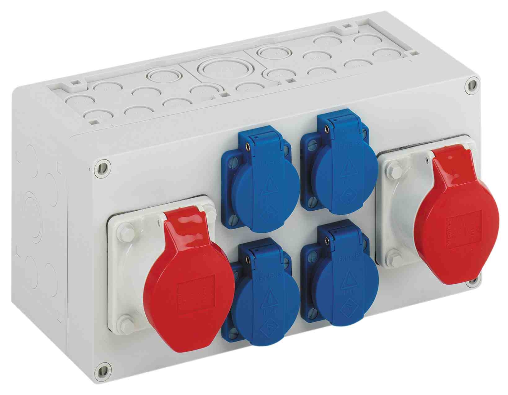Zásuvková kombinace, se stupněm krytí IP44, s vestavěnými, předem zapojenými zásuvkami, vysoká mechanická zatížitelnost, odolná vůči extrémním teplotám, kombinovatelná, bez halogenů, vybaveny: 4 x SCHUKO® zásuvka (na přední straně), 230 V 2 x Zásuvka CEE (na přední straně) 16 A, 400 V Rozměry: 300 x 150 x 132 mm Přiložené příslušenství: Dvojitá membránová vývodka: 1x M20, 1x M25, 1x M32, Vývodka: 1x M40, Zaslepovací zátky, Krycí a popisovací pásky
