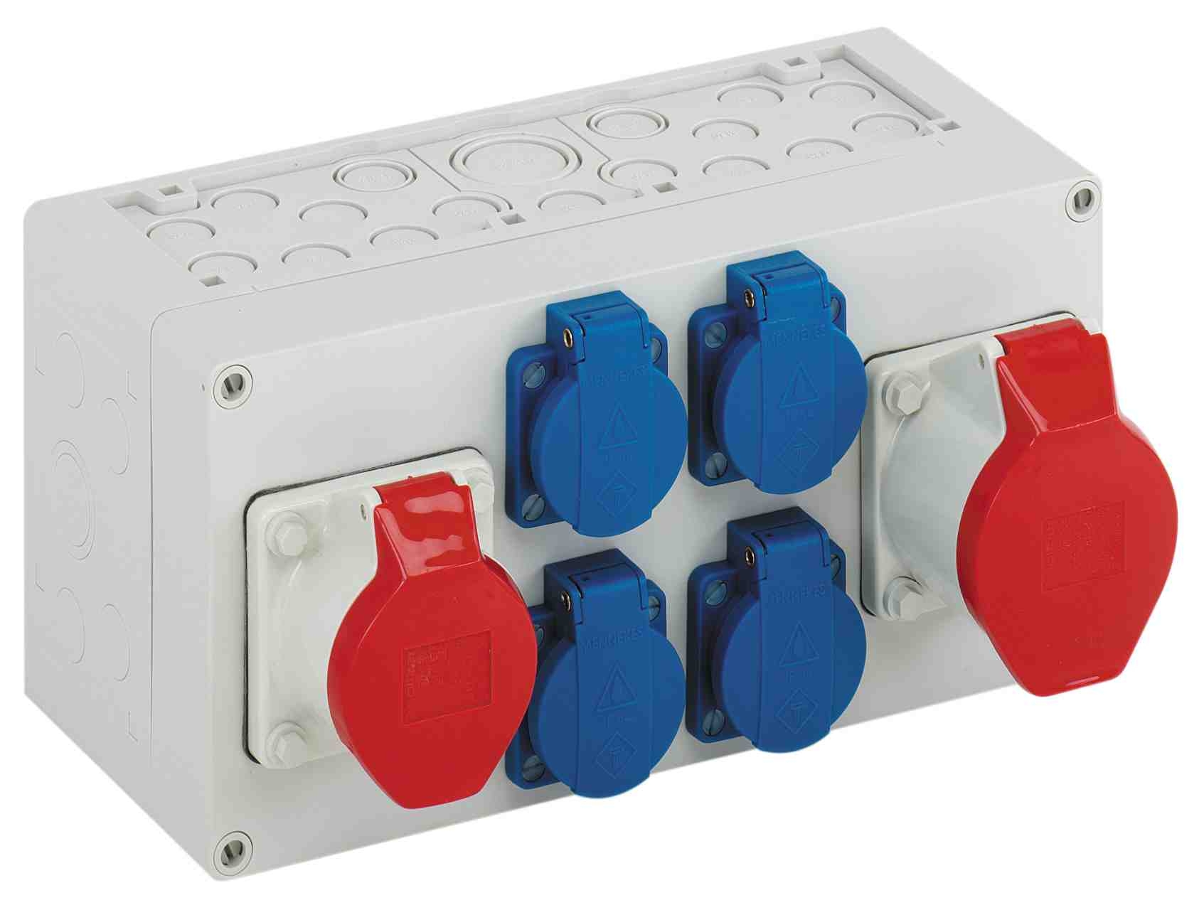 Zásuvková kombinace, se stupněm krytí IP44, s vestavěnými, předem zapojenými zásuvkami, vysoká mechanická zatížitelnost, odolná vůči extrémním teplotám, kombinovatelná, bez halogenů, vybaveny: 4 x SCHUKO® zásuvka (na přední straně), 230 V 1 x Zásuvka CEE (na přední straně) 16 A, 400 V 1 x Zásuvka CEE (na přední straně) 32 A, 400 V  Rozměry: 300 x 150 x 132 mm Přiložené příslušenství: Dvojitá membránová vývodka: 1x M20, 1x M25, 1x M32, Vývodka: 1x M40, Zaslepovací zátky, Krycí a popisovací pásky