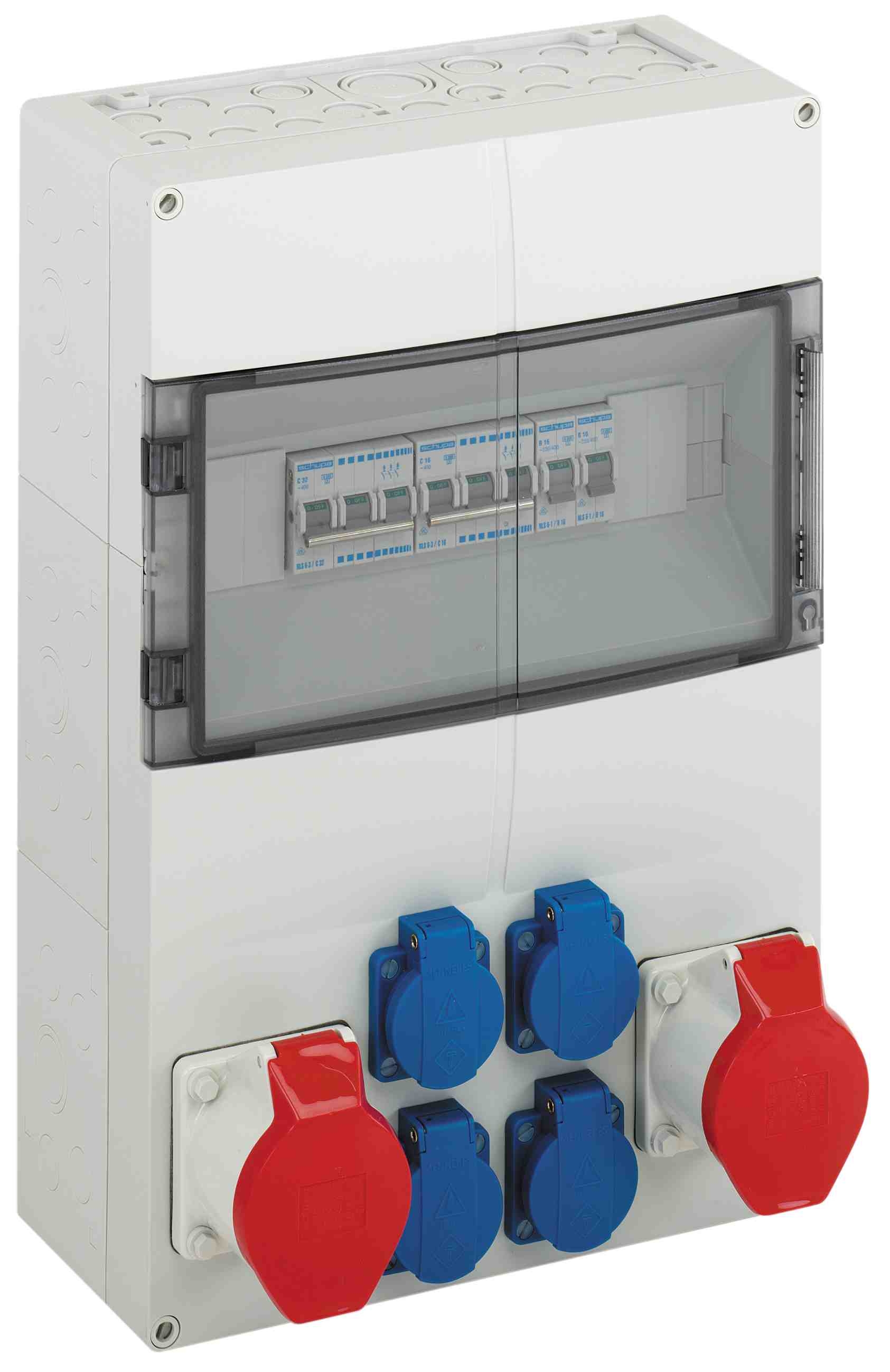 Zásuvková kombinace, se stupněm krytí IP44, připravená k zapojení, podle EN 61439-3, vysoká mechanická zatížitelnost, odolná vůči extrémním teplotám, kombinovatelná, vybaveny: 2 x Výkonový spínač V16A, 1-pólový 2 x Výkonový spínač C32A, 3-pólový 4 x SCHUKO® zásuvka (na přední straně), 230 V 2 x Zásuvka CEE (na přední straně) 32 A, 400 V  Rozměry: 300 x 450 x 142 mm Přiložené příslušenství: Dvojitá membránová vývodka: 1x M20, 1x M25, 1x M32, Vývodka: 1x M40, Zaslepovací zátky, Krycí a popisovací pásky