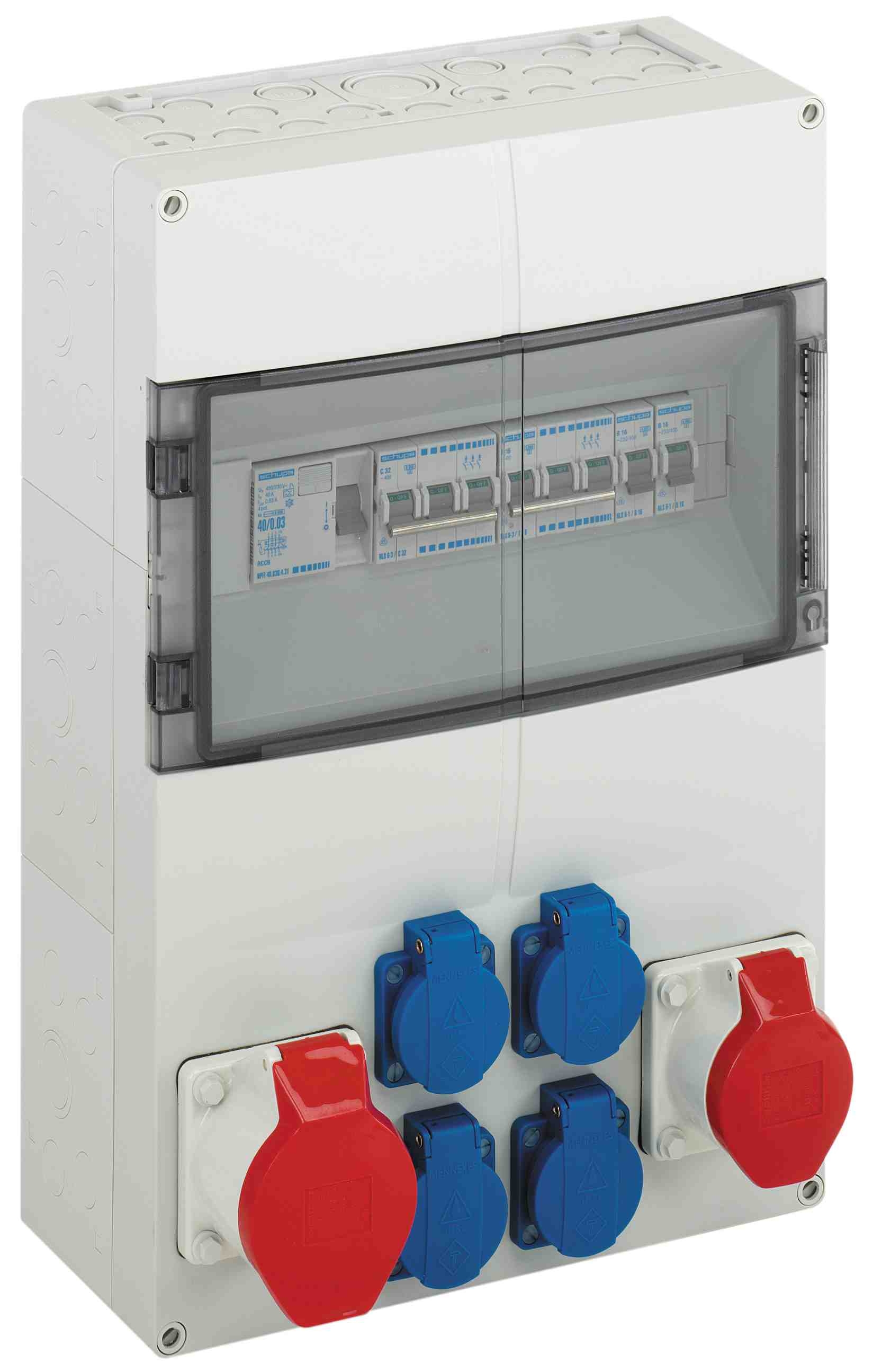Zásuvková kombinace, se stupněm krytí IP44, připravená k zapojení, podle EN 61439-3, vysoká mechanická zatížitelnost, odolná vůči extrémním teplotám, kombinovatelná, vybaveny: 1 x Proudový chránič (RCCB), 40/0,03A, 4-pólový, typ A 2 x Výkonový spínač V16A, 1-pólový 1 x Výkonový spínač C16A, 3-pólový 1 x Výkonový spínač C32A, 3-pólový 4 x SCHUKO® zásuvka (na přední straně), 230 V 1 x Zásuvka CEE (na přední straně) 16 A, 400 V 1 x Zásuvka CEE (na přední straně) 32 A, 400 V  Rozměry: 300 x 450 x 142 mm Přiložené příslušenství: Dvojitá membránová vývodka: 1x M20, 1x M25, 1x M32, Vývodka: 1x M40, Zaslepovací zátky, Krycí a popisovací pásky