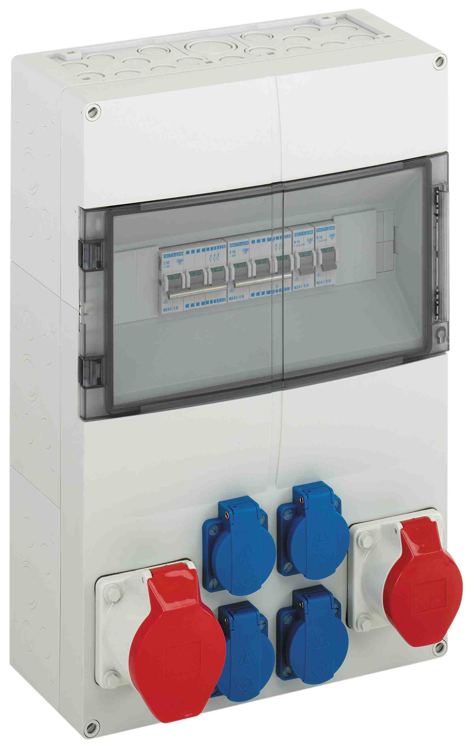Zásuvková kombinace, se stupněm krytí IP44, připravená k zapojení, podle EN 61439-3, vysoká mechanická zatížitelnost, odolná vůči extrémním teplotám, kombinovatelná, vybaveny: 2 x Výkonový spínač V16A, 1-pólový 1 x Výkonový spínač C16A, 3-pólový 1 x Výkonový spínač C32A, 3-pólový 4 x SCHUKO® zásuvka (na přední straně), 230 V 1 x Zásuvka CEE (na přední straně) 16 A, 400 V 1 x Zásuvka CEE (na přední straně) 32 A, 400 V  Rozměry: 300 x 450 x 142 mm Přiložené příslušenství: Dvojitá membránová vývodka: 1x M20, 1x M25, 1x M32, Vývodka: 1x M40, Zaslepovací zátky, Krycí a popisovací pásky